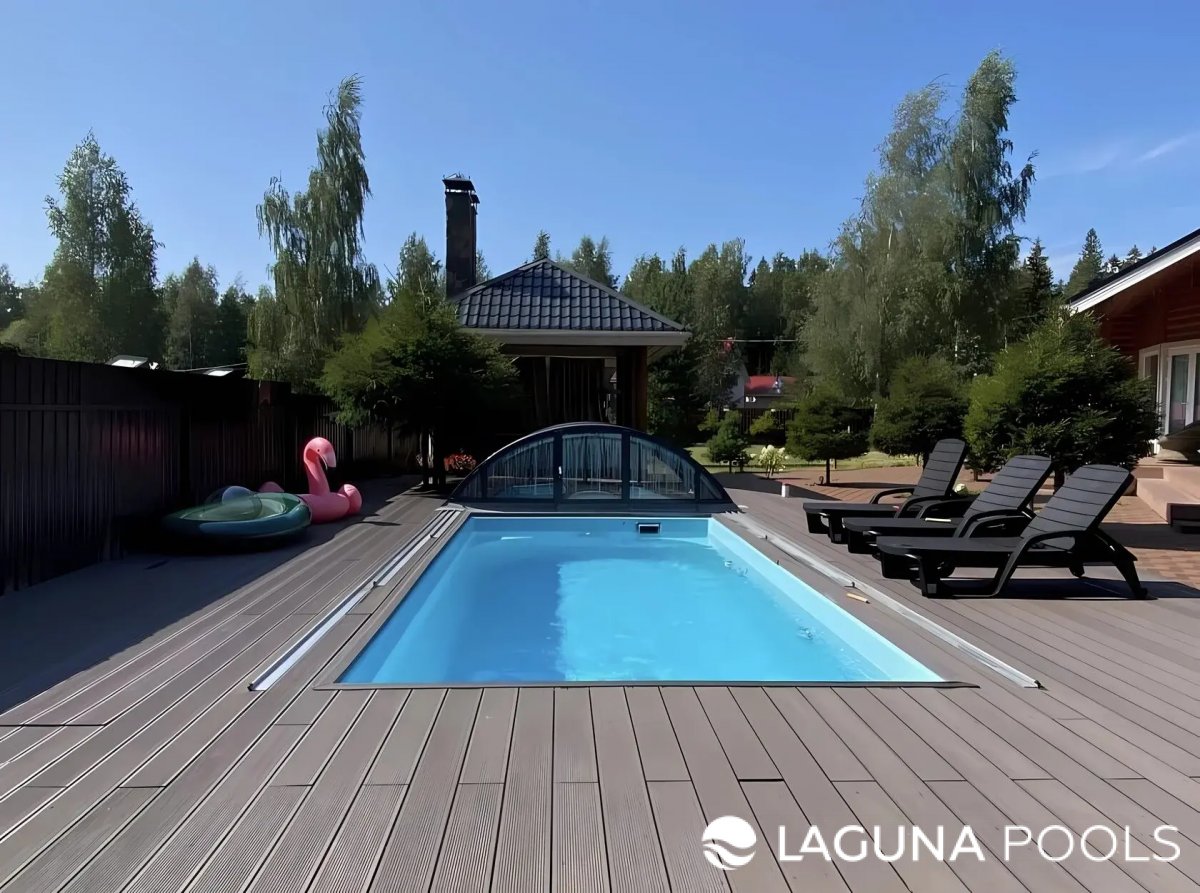 Прямоугольный бассейн с голубой водой на открытой террасе из серой композитной доски с тремя черными шезлонгами и сдвижным накрытием.